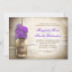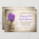 Fundo romântico de madeira rústica e jarro de mason com convites para festa de noivado de flores roxas. Sugiro papel texturizado para esta design.