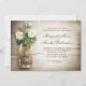 Fundo romântico de madeira rústica e jarro de mason com convites para festa de noivado de flores brancas. Sugiro papel texturizado para esta design.