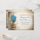 Fundo romântico de madeira rústica e jarro de mason com convites de festa de noivado de flores azuis-claras. Sugiro papel texturizado para esta design.