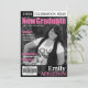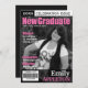 Convites de graduação que se parecem com o cobrir de uma revista. Personalize com a foto do formando, informações escolares e detalhes da festa. Para obter melhores resultados, use uma foto de alta resolução mostrando a metade superior do formando. Podem ser utilizadas fotografias a preto e branco ou a cores.