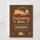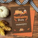 Convites de festas jantes de Ação de Graças, de cor castanha e laranja. Apresenta abóboras, torta, café e folhas de outono na frente, sobre fundo castanho escuro. As costas são um padrão laranja do Tartan. Ele não tem peru , então o torna perfeito para grupos vegetarianos ou veganos :).Personalização é fácil. Apenas preencha os campos de modelo com suas próprias informações. © ArianeC Ilustrações — Todos os direitos reservados
