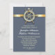 Convite de janto de ensaio náutico com design azul e âncora de fita de ouro com roda de barco.