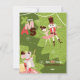 Um convite para uma festa de Natal com um pregador, uma bailarina e um rei de rato num estilo plano para crianças. Modelo de cartão de convite em tons cor-de-rosa e verde.