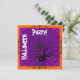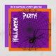 Convites de festa de Halloween são roxos com uma borda laranja. A frente do convite também apresenta uma grande teia de aranhas pretas com uma grande aranha viúva preta subindo nela. O texto da frente é branco e corre vertical e horizontalmente ao longo do convite. O texto diz Festa de Halloween! mas pode ser mudado se quiser. O lado inverso do convite é roxo com fonte branca. O texto pode ser personalizado para atender às suas necessidades. Estes convites para o Dia das Bruxas na Web são um excelente de espalhar a notícia sobre a sua próxima festa de Halloween!