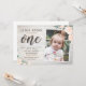 primeiro aniversario de menina russa com fotos e design de chique floral. Incorporado com um roteiro manuscrito e flores rosa cor-de-água rosa-claro sobre um fundo branco de madeira. Excelente para qualquer festa de aniversário temática. Personalize o texto com seu texto.