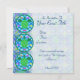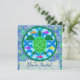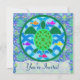 Cartões de convite de dois lados. O Front tem o personalizável "Você é Convidado". Voltar tem tem informações de convite — introduza o título do evento, a data, a hora, a localização e uma mensagem pessoal. Uma tartaruga marinha verde com casca com padrões de água/ondas azuis, com vários peixes coloridos. design circular com uma borda verde.