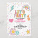 Concurso de aniversário pré-pago com arco-íris, coração e sinal de paz.