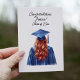 Este cartão de formatura fofo apresenta uma mulher ruiva com vestido azul real. Personalize com o nome do aluno e informações da turma. O interior é deixado intencionalmente em branco para que você possa escrever uma mensagem pessoal. Peça o seu agora!