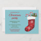 Design de convite de festas de Natal Festivo com a ilustração original de Destei de uma estocagem vermelha de Natal que tem duas canetas doces saindo dela. A cor de fundo é azul. Personalize as áreas de texto de exemplo com os detalhes do seu evento.