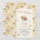 This honeycomb baby shower invitation features a “Parents to Bee” theme with a cute bee holding a sunflower, surrounded by flowers and buzzing bees on a warm honeycomb background. The cheerful and playful design makes it a perfect personalized baby shower invitation.
