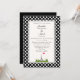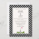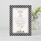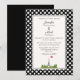 Um convite de casamento com um desenho cômico da Torre Eiffel no fundo cercado por árvores verdes. O fundo é um padrão de bolinhas preto e branco.