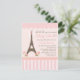chá de fraldas lindo e super feminino apresentando uma Torre Eiffel marrom com uma fita rosa no topo. Flores cor-de-rosa fofinhas na base das torres, bem como listras cor-de-rosa e outros ornamentos delicados fazem deste convite uma escolha perfeita para uma celebração muito feminina e doce de chás de fraldas. NOTE: