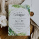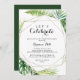 Este convite de festas de celebração de vamos de destino geométrico é perfeito para uma festa de noivado tropical, festa de solteira, aposentadoria, graduação, casamento após festa ou qualquer evento ou festa. O design apresenta palma verde-aquarela pintada à mão e folhas de bananeira bem organizadas em belos buquês, enfeitando um quadro geométrico dourado.