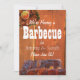 Quintal, fundo de madeira com fotos de asas de frango no canto superior esquerdo e costelas de churrasco no fundo na frente. Inclui texto personalizável na parte frontal e traseira dos modelos de cartão. O lado inverso tem um fundo escuro e fumegante, com fotos de costelas de churrasco de porco no fundo.