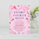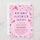 Esse convite de aniversário bonito, meninas, tem uma paleta de cor rosa e roxa, O design inclui tipografia divertida, giras e corações giros, secador de cabelo, pente, arco de cabelo, pincel, batom, e um fundo rosa bonito. O texto adicional pode ser adicionado à parte traseira da placa, se necessário.