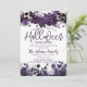 Um belo convite de festa floral floral púrpura para o Dia das Bruxas. Este design roxo e preto, gótico, com flores e crânios. Fácil de personalizar com sua própria festa de casa aberta no halloween, ou pote luck halloween detalhes da festa do templo.