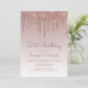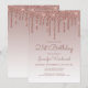 Este convite de aniversário de 21 anos de tendência apresenta uma borda brilhante de falso glitter glitter rosa dourado cintilante e fundo ombre. As palavras "aniversário de 21 anos" e o nome do convidado de honra aparecem em um roteiro casual de rosa escuro, com o resto do texto personalizável na fonte sans serif. O mesmo design de gotejamento rosa dourado aparece no verso. Edite facilmente o texto para qualquer aniversário de idade.
