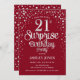 Convite de festas de aniversário de 21 anos surpresa. Design elegante em vermelho escuro e prata brilhante fraca. Possui fonte de script na moda e confetti. Envie-me uma mensagem se precisar de idade personalizada.