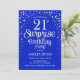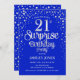 Convite de festas de aniversário de 21 anos surpresa. Design elegante em azul real e prata brilhante falso. Possui fonte de script na moda e confetti. Envie-me uma mensagem se precisar de idade personalizada.