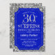 Convite de celebração de aniversário de 30 anos surpresa. Design elegante em azul real e padrão de prata brilhante. Apresenta uma fonte elegante de script. Envie-me uma mensagem se precisar de mais personalização.