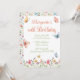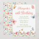 Detalhes personalizáveis do convite de festas aniversário de 40 anos sobre uma ilustração deliciosa e delicada de flores silvestres e borboletas aquáticas na frente do convite. e um lindo padrão de flor silvestre e borboletas na parte de trás