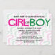 Gênero bonito revela convites de festas de chás de fraldas! Modelo é fortemente tipografia focada na paleta de cores verde e rosa com as palavras "Garota" e "Garoto" e as perguntas marcam como pano de fundo da design.