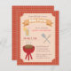 O verão é uma grande estadia para um partido do churrasco seja ele em seu quintal ou na praia! Convide seus amigos e família sobre para um partido do assado com este convite que tem uma grade antiquado, cozinhando ferramentas, bife e bebidas. Fundo do teste padrão da xadrez do marrom avermelhado. Personalize com seus detalhes do partido. O partido do churrasco é grande para aniversários de todas as idades e várias celebrações!