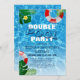 Uma festa de aniversário dupla significa o dobro da diversão. Convidar amigos e família juntamente com este convite de aniversário de piscina de natação legal, desenhado para uma comemoração de aniversário conjunta. Apresentando uma vibração tropical com água azul clara, insufláveis, folhas tropicais, uma flor amarela e um modelo de aniversário de tendência que pode ser facilmente personalizado.