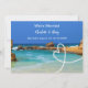 Convite ideal para o casal se casar em Chipre, que quer celebrar o seu casamento com amigos e familiares de volta para casa quando regressarem. Foto cênica de Chipre com mar azul, céu, rochas e praia com bonito miçangas brancas em forma de coração e doces corações de amor dourado.