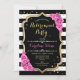 Convite de festas de aposentadoria design cor-de-rosa branco preto elegante com falso brilho. Listras brancas e pretas com rosas cor-de-rosa. Perfeito para uma festa elegante.