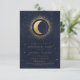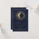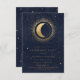 Convite de festas de aposentadoria apresentando uma bela lua crescente com estrelas douradas sobre um fundo azul de meia-noite de veludo emparelhado com fontes elegantes. Fácil de personalizar com sua foto e informações.