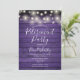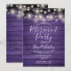 Com luzes de cordas em um fundo de painéis de madeira rústica roxa, este convite de festas de aposentadoria de na moda pode ser personalizado com suas informações especiais de evento. Projetado por Thisnotme©