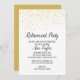 Este convite de festas de aposentadoria de "confetti" de ouro é perfeito para uma elegante celebração de aposentadoria. O design apresenta um confete dourado sobre fundo branco, com caligrafia de cinza escura.