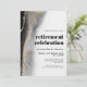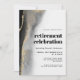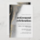 Este moderno convite à celebração da reforma abstrato tem um apelo sofisticado. Um simples padrão de abstrato pintado ao longo da borda esquerda do design em carvão, preto e ouro adiciona um toque de cor e estilo ao convite. Um layout de texto simples transmite sua mensagem elegantemente. Este convite é uma escolha perfeita para celebrar a aposentadoria de qualquer gênero. Personalize o modelo de texto com suas informações de evento. Este convite pode ser encomendado sob a forma de convites impressos ou como transferência digital sem papel, ou ambos!