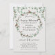Convite de festas de retirada de folhas botânica e folhagem de jardim russo, com eucalipto e cobertura de algodão sobre um fundo de textura de linho creme. Tipo de face aberta elegante contrastado com uma tipografia de script de estilo floral.