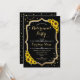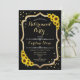 Convite de festas de aposentadoria. Design preto com ouro brilhante falso. Possui girassóis, fonte na moda e confetti. Perfeito para uma festa elegante.