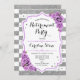 Convite de festas de reforma. Design púrpura branca elegante com prata brilhante falso. Listras prateadas e brancas com rosas. Perfeito para uma festa elegante.