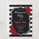 Convite de festas de reforma. Elegante design vermelho preto branco com falso brilho prata. Listras pretas e brancas com rosas vermelhas. Perfeito para uma festa elegante.