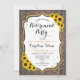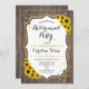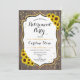 Convite de festas de aposentadoria russo. Design elegante com ouro brilhante. Apresenta fontes de script, girassóis e padrão de madeira de celeiro escuro. Perfeito para uma festa elegante.