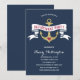 Este convite de janto de aposentadoria com tema náutico glamouroso apresenta uma âncora falsa de ouro, um banner azul e branco de vintage rústico, um coração vermelho giro e um fundo azul marinho.