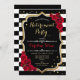 Convite de festas de reforma. Design vermelho preto elegante com brilho falso. Listras pretas e brancas com rosas vermelhas. Perfeito para uma festa elegante.