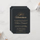 Um convite de festas com uma ilustração dourada sobre um fundo de cinza preta. Projetado com uma ilustração de uma montanha com raios solares brilhando por trás. Abaixo das montanhas está a palavra "Aventura" escrita numa letra de script retrorreflectora.