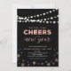Comemore o primeiro dia do novo ano com este convite de festas de véspera de Ano Novo moderno. Este design apresenta rosa dourado "Saúde ao ano novo" tipografia e flocos de neve e luzes de cordas em um fundo preto. Você pode personalizar o texto e a cor do plano de fundo.