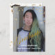 Este simples e moderno convite à festa de formatura apresenta uma fotografia de cheio do seu formando com a moderna cobertura de caligrafia e estrelas de folha de ouro. O reverso tem um boné de formatura e um diploma no canto e todos os detalhes da festa de formatura com mais algumas estrelas de folha de ouro.