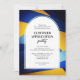 Este convite de festas de apreciação do cliente apresenta um quadro branco arquitetado moderno em um fundo azul escuro, azul escuro e abstrato ouro.