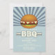 Convite de CHURRASCO de Vintage com faixas azuis radiais com um hambúrguer grande colocado em uma parte de trás azul e com uma correspondência de volta para um toque especial extra. Perfeito para um churrasco de verão, festa de dia de memorial, 4 de julho, festa de dia de trabalho, reunião de família ou uma festa de piscina e churrasco.
