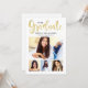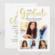 O cartão de anúncio de graduação e o convite de festas apresentam apenas "Formando" em um roteiro de caligrafia com uma moderna colagem de fotos de quatro (4) fotos do formando. O design de placa de dois lados inclui o texto da festa de formatura "Celebrar Vamos" e detalhes na parte traseira. Design branco e preto clássico com sotaques dourados.