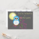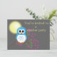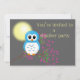 Um desenho bonito de uma coruja azul em um ramo florescido. Fundo de cinzas médias com uma lua pálida e as estrelas. Esse de um convite de festas amável do descanso. Você pode editar o texto traseiro se desejado.