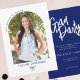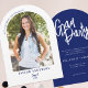 Celebre o marco do seu formando em estilo com este Convite de festas de Formando Azul de Foto do Arco de Script Moderno Elegante. Convide a família e os amigos com este cartão, que contém um guião manuscrito moderno, um trendy arch layout e uma foto personalizada, este design combina sofisticação com um toque pessoal. Perfeito para comemorações de segundo grau ou formandos, este convite define o tom de um evento inesquecível. Personalize com o nome de seu formando, ano de aula e detalhes de festas em um rico marinho azul marinho. Uma escolha na moda para festas de formatura, comemorações de casa aberta ou reuniões virtuais.