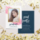 Anúncio de graduação em chic e convite de festas de formando com aquarela cor-de-rosa com pequenas lâminas de folha de ouro falsas e borda de folha de ouro falso em torno da foto. O convite tem um lado azul nas costas. Personalize-o substituindo o texto do marcador de posição e substitua a foto do marcador de amostra/marcador de posição por sua própria foto. Para obter mais opções, como alterar a fonte e seu tamanho/cor ou o espaçamento entre letras, clique no botão "Personalizar". *Observe que a Marca d'água do Zazzle que aparece na visualização de zoom NÃO aparecerá no produto impresso final. © Rosewood e Citrus